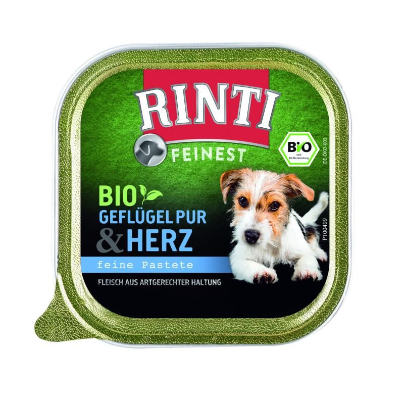 Rinti Feinest Bio - Feine Pastete, aus kontrolliert ökologischer Landwirtschaft, unabhängig zertifiziert DE-ÖKO-003 Bio-Heimtierfuttermittel, Herstellerbetrieb AT-Bio-301. Das Fleisch stammt aus artgerechter Haltung (z. B. freier Auslauf) und biologischer Ernährung.